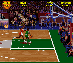 ・迫力ある画面が好評だった『NBA JAM』の続編。2on2で対戦する基本的なシステムに変更はないが、登場する選手が倍以上に増えて色々なペアが組めるようになった。シュートやパスの練習もできる。