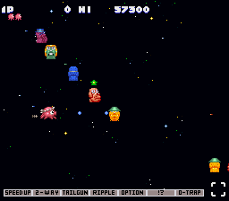 | プレイヤーセレクト画面でカーソルをタコに合わせ、上、L、Xを押し続ける。 | ステージセレクトモードになる。さらに、「MUTEKI」欄を01にすると、自機が無敵で2段階スピードが上がり、ミサイルとシールドに加え、オプションを最大装備した状態でプレイできる。 |