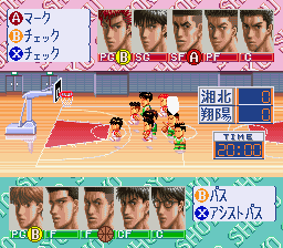 - デモ画面でシュートシーンで、Rを押しながら、A、Y、B、X、A、Y、B、X、右、左、下、上の順に入力。エキジビジョンの「1P VS 2P」で、桜木、赤城、流川、仙道、魚住、牧、花形の誰かをベンチに残すと、残したキャラだけのチームが出来上がる。