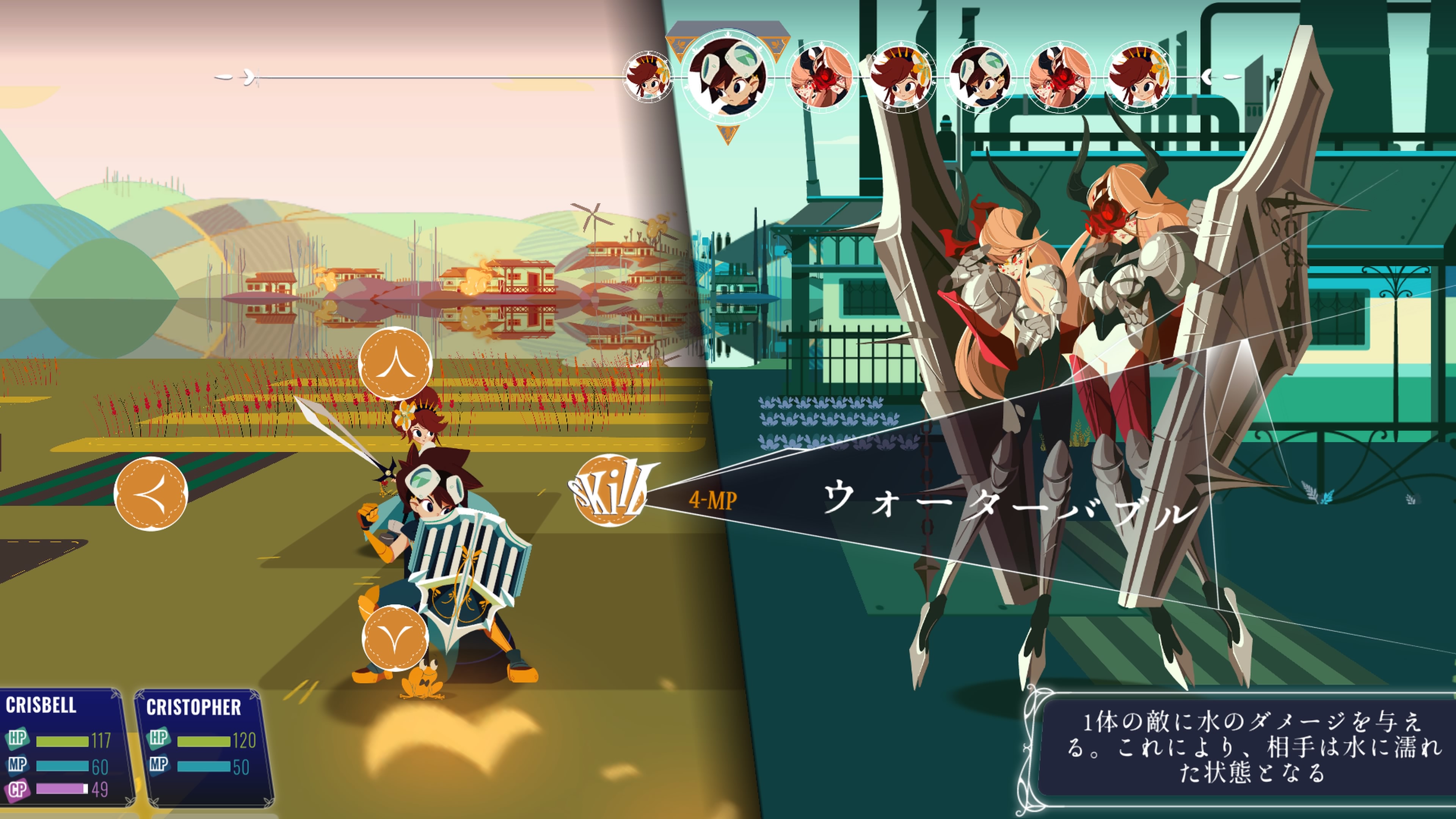盾を構えた敵に対して、水属性で攻撃した後に「時を進める」と、盾が錆びて攻撃が通るようになるなど、バトルでも時を操る能力を生かして進めていきます。